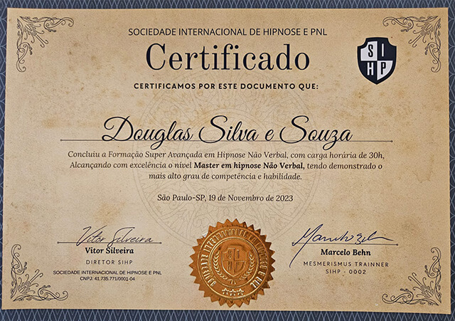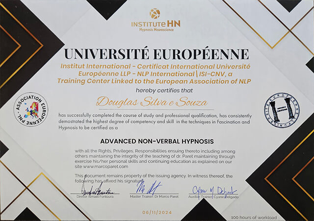 Formações em Hipnose Não Verbal Avançada (Institut International), Hipnose Clássica, e Trainer em Hipnose Não Verbal, Fascinação e Mesmerismo