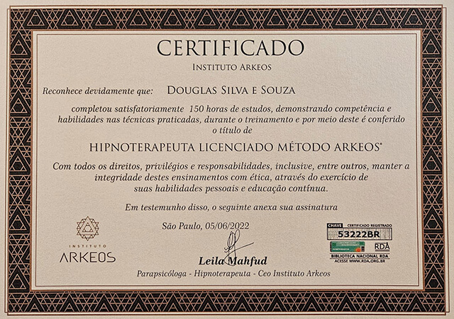 Hipnoterapeuta pelo Método Arkeos e Professor do Instituto Arkeos